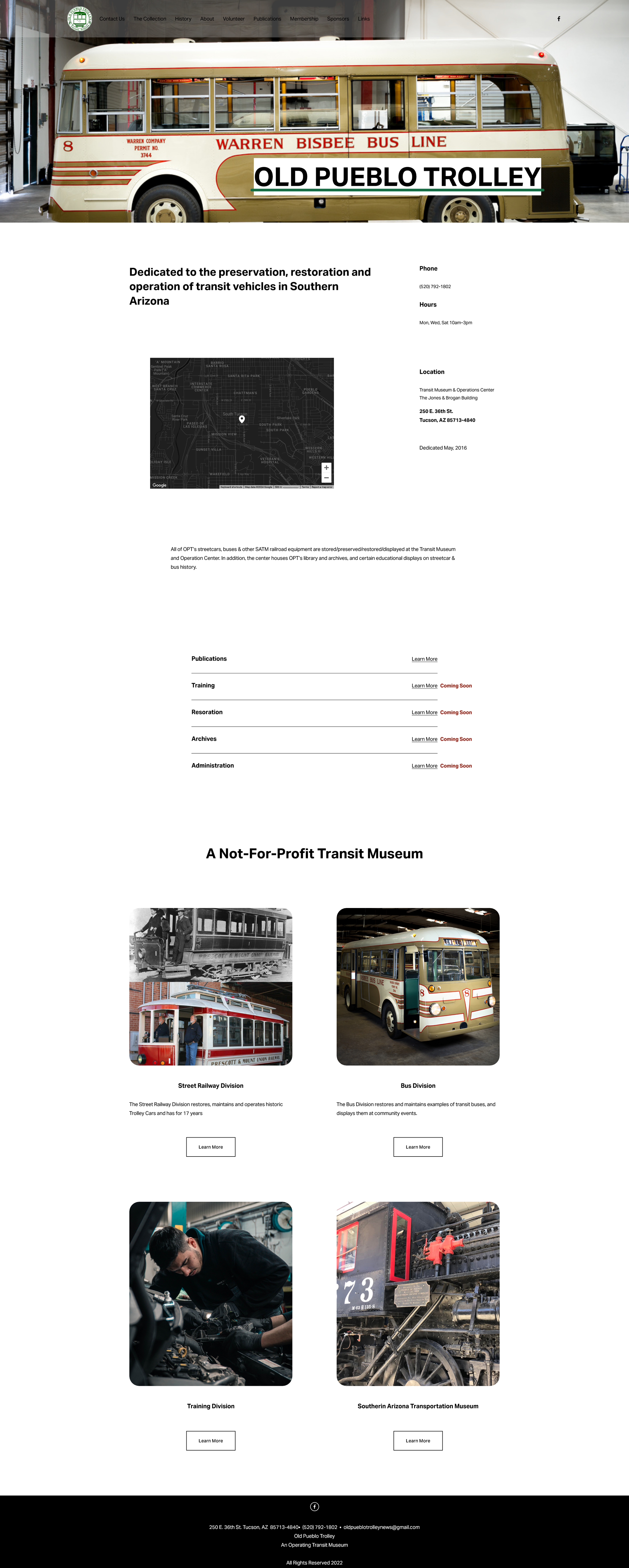 Dedicated to the preservation, restoration and operation of transit vehicles in Southern Arizona. Old Pueblo Trolley is a volunteer, non-profit corporation founded in 1983 to “Bring Back the Trolley” that once connected downtown with the university. With that as the first goal, volunteers installed track and overhead electric line, and restored and operated trolleys for over 18 years until the City removed the infrastructure for construction of their modern streetcar.